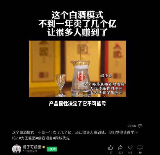 偶然刷到一个视频,是一位名为“帽子哥凯德”的生活博主在2023年12月1日发布的内容,说的就是为国酱酒的“搞钱”模式。帽子哥说:为国酱酒起盘不到一年,就卖了几个亿……