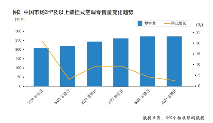 据GfK中怡康预测数据,2024年大冷量壁挂式空调市场的零售量将达到210万台,同比增长20.3%;到2029年,大冷量壁挂式空调市场的零售量有望达到276万台(见图2)。