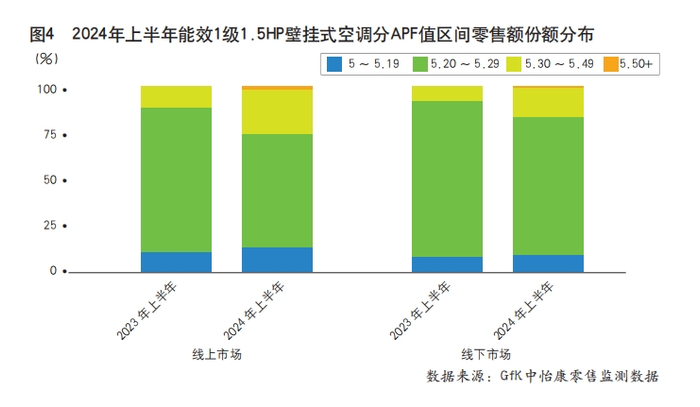 节能省电一直是消费者购买家用空调时最看重的卖点。伴随能效1级产品在家用空调市场的份额不断跃升,这类产品的可增长空间越来越小,提升空调产品的APF值将成为未来的市场趋势之一。据GfK中怡康零售监测数据,2024年上半年,APF值在5.30及以上的产品在线上、线下市场能效1级1.5HP壁挂式空调市场的零售额份额分别为25.7%和16.4%,同比分别增长14.6和8.2个百分点(见图4)。