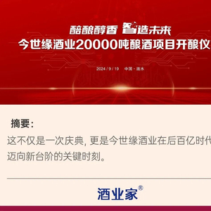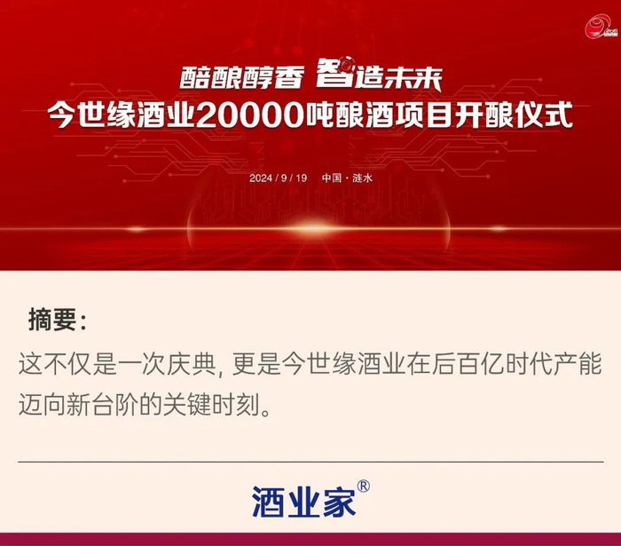 9月19日,涟水,今世缘酒业将迎来“醅酿醇香 智造未来”20000吨酿酒项目开酿仪式,将邀请全国百家媒体、酒业大咖实地探访今世缘智能化酿造基地,并举办从“158计划”到“智改数转”——中国白酒技术创新与高质量发展专家论坛,为白酒酿造数字化、智能化提供新方向。