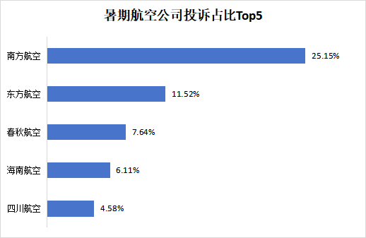 在暑期航司投诉占比方面,排名前五的依次是南方航空、东方航空、春秋航空、海南航空和四川航空。各大航空公司涉及的投诉问题包括退改问题、服务态度差、虚假宣传、霸王条款和航班延误等方面。