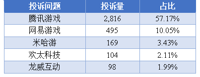 暑期网络游戏投诉量排名前五的商家分别为腾讯、网易、米哈游、欢太科技和龙威互动。其中腾讯游戏投诉占比高达57.17%,网易游戏占比为10.05%。
