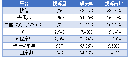 投诉量排名靠前的在线旅游平台中,携程投诉量最高,共5,062件,投诉解决率为48.56%;去哪儿、中国铁路(12306)投诉量分别位居第二和第三,投诉量为2,963件、2,924件。