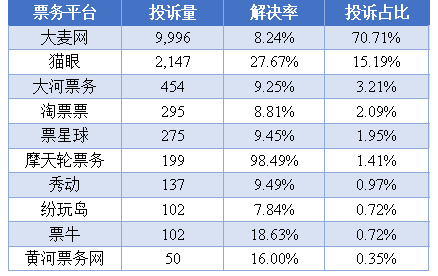 在所有票务平台中,大麦网以9,996件投诉位居榜首,占比高达70.71%;猫眼平台投诉量为2,147件,占比15.19%,位列第二;此外,大河票务、淘票票、票星球、摩天轮票务、秀动等平台也位居投诉榜前列。