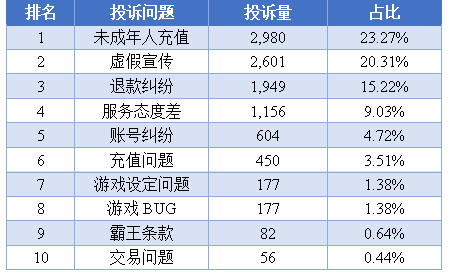 投诉问题中,未成年人充值相关投诉共有2,980件,占比为23.27%。暑期孩子放假在家,一些家长未能妥善管理其电子设备的账号和支付密码,导致孩子在家长不知情的情况下进行游戏充值等消费行为。此外,虚假宣传、退款纠纷及服务态度差等投诉问题也比较靠前。