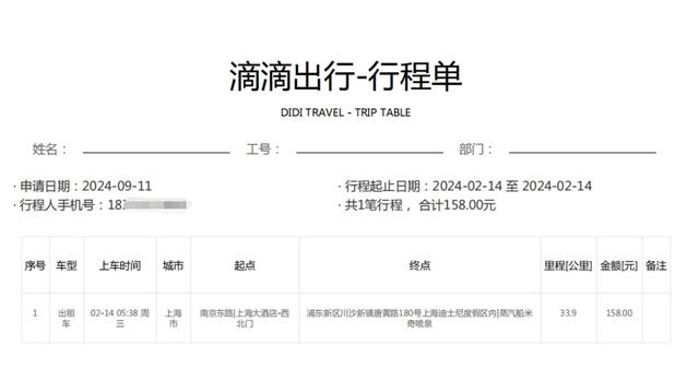 2月14日5时25分,黄文得从此前入住的酒店退房,一家三口花费158元打车前往上海海宸假日酒店,6时39分到达。