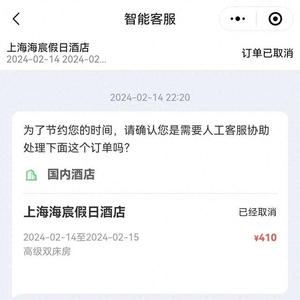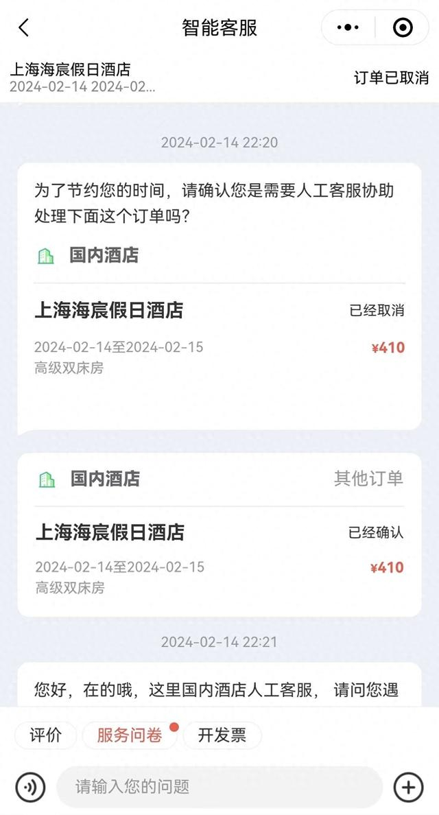 因为次日一家三口要去上海迪士尼游玩,2024年2月13日23时19分,黄文得在同程旅行APP上看到上海海宸假日酒店2月14日-2月15日高级双床房“可订”,遂下单并支付410元,后订单显示“已获确认”。
