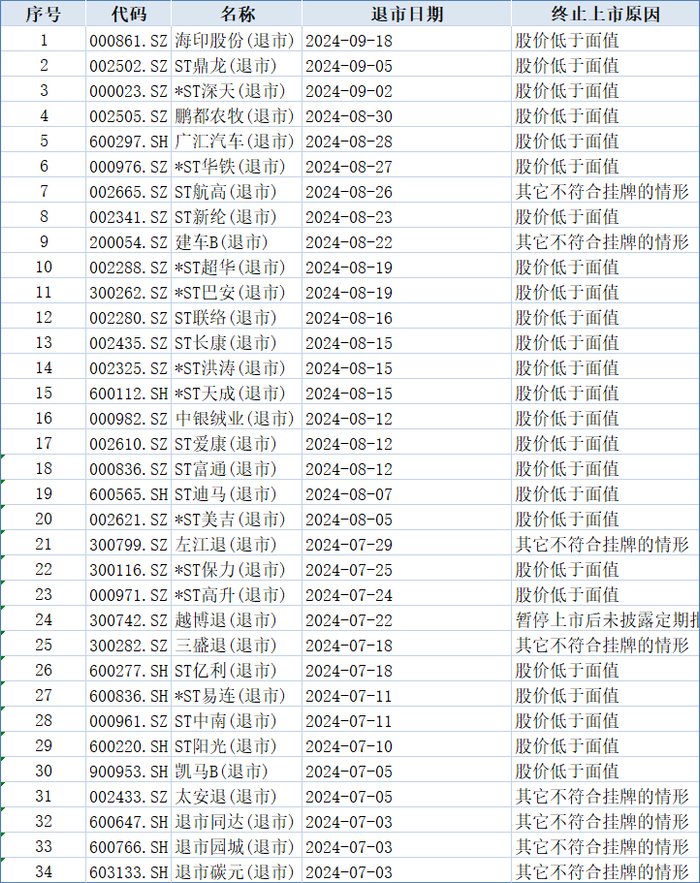 退市公司数量也在持续增加。9月18日,海印股份正式摘牌,本月早前,*ST深天、ST鼎龙先后退市。今年7月至今,已有34只个股退市,面值退市占到七成。