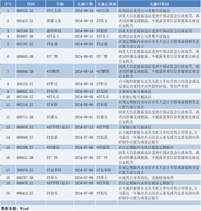 Wind数据显示,7月至今,共计19家A股公司被实施ST,原因包括信披违规被证监会行政处罚、公司被控股股东及关联方非经营性占用资金、收到法院受理公司重整申请裁定等。
