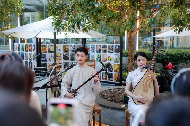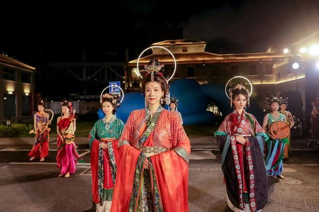 随着悠扬而唯美的乐曲声响起,“神仙拜月图”国风主题演出率先登场,一群身着法海寺、永乐宫、敦煌等壁画复原款汉服的女子,沿着海派历史建筑“扆虹园”间的小径鱼贯而出。演出以舞蹈形式再现了中秋“拜月祈福”的传统习俗,亦动亦静,有些演员盈盈伫立似亘古不变的月,有些则时而手持琵琶、月琴、笛、手鼓等乐器惊鸿起舞,时而挥动红绸扇旋转起跳,表达着对美好与圆满的憧憬。历史与现代、传统与新潮,随着隽永而有力的汉服音舞共振于当下,令现场所有观众感受到中国美学的无限诗意与生命力。
