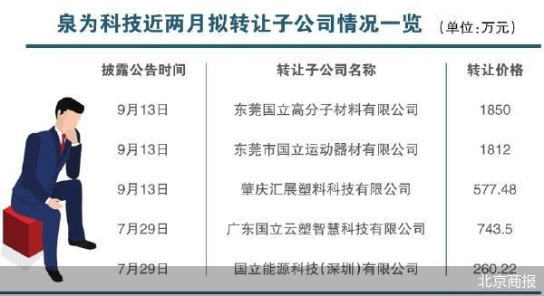 自今年7月29日以来,泉为科技相继披露了5则转让子公司股权公告,其中仅9月13日一日就披露了3则,公司拟将全资子公司东莞国立高分子材料有限公司100%股权、东莞市国立运动器材有限公司100%股权、肇庆汇展塑料科技有限公司100%股权转让给自然人梁龙飞,转让价格分别约为1850万元、1812万元、577.48万元,合计约为4239.48万元。