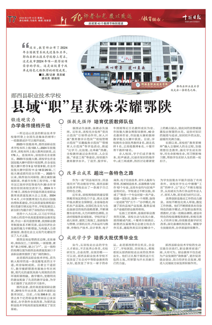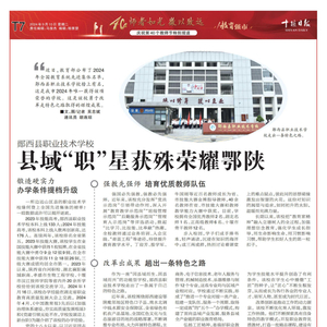 近日,教育部公布了 2024年全国教育系统先进集体名单,郧西县职业技术学校榜上有名,这是我市2024年唯一获得该项荣誉的学校。这是该校勇于改革走特色之路取得的辉煌成果。