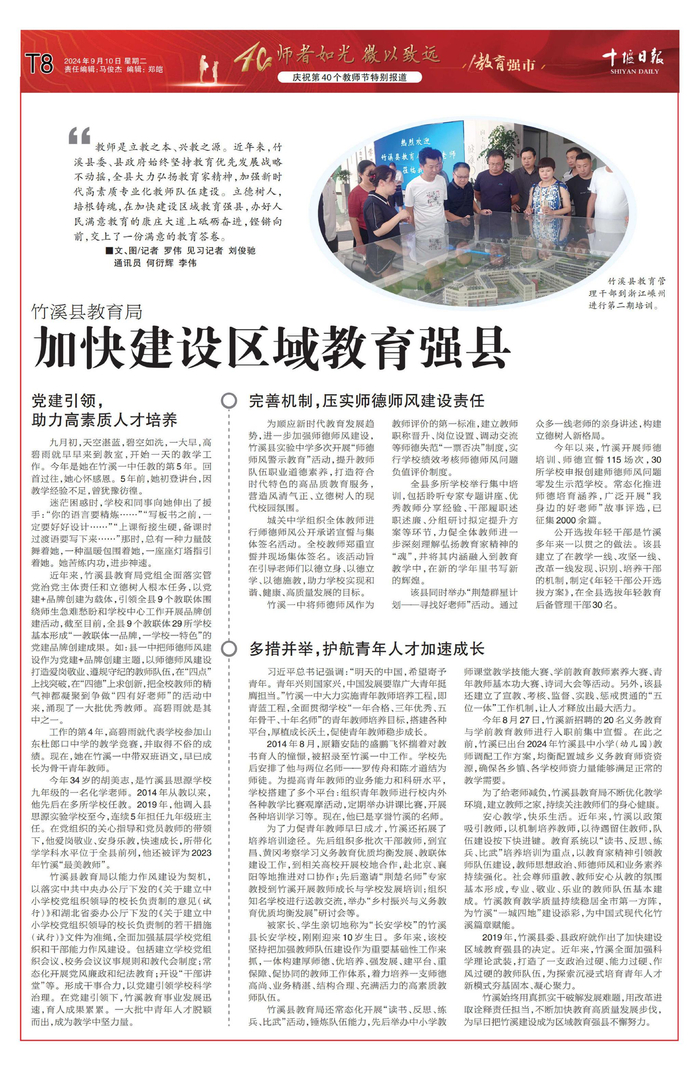 安心教学,快乐生活。近年来,竹溪以政策吸引教师,以机制培养教师,以待遇留住教师,队伍建设按下快进键。教育系统以“读书、反思、练兵、比武”培养培训为重点,以教育家精神引领教师队伍建设,教师思想政治、师德师风和业务素养持续强化。社会尊师重教、教师安心从教的氛围基本形成,专业、敬业、乐业的教师队伍基本建成。竹溪教育教学质量持续稳居全市第一方阵,为竹溪“一城四地”建设添彩,为中国式现代化竹溪篇章赋能。