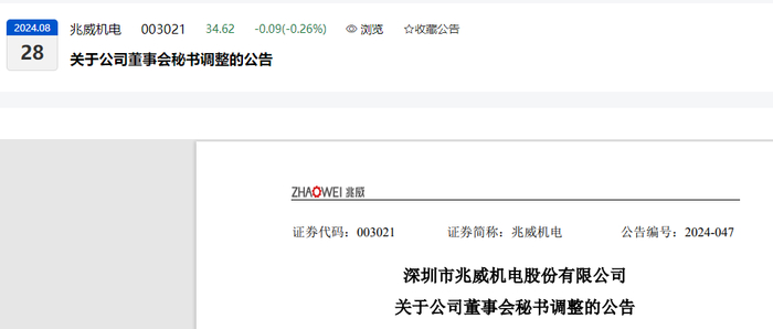 6、2024-08-28兆威机电:关于公司董事会秘书调整的公告