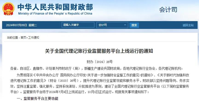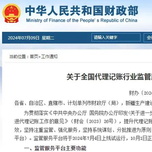 7月3日,财政部发布《关于全国代理记账行业监管服务平台上线运行的通知 》。