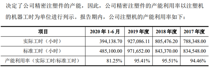 首先看产能利用率相关信息。根据招股书披露,公司精密注塑件的产能利用率以注塑机的机器工时为单位进行列示,2019年上半年实际工时为92.71万小时;同时截至当年末,兆威机电拥有的注塑机设备数量为116台。