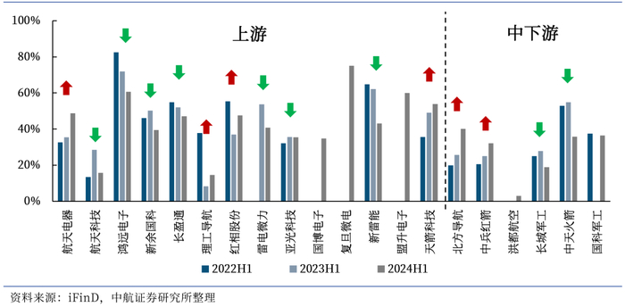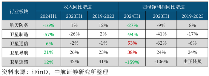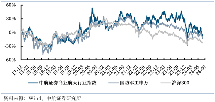 ① 航天行业指数(-9.66%)整体跑输军工行业(-8.90%)。当前,航天产业上市公司2024年中报财务数据已披露完毕,航天板块整体延续了2023年年报和2024年一季报收入与净利润放缓的“惯性”,表现出了在利润表迎来拐点的预期尚未充分建立下,市场对航天板块2024年收入业绩修复的不确定性仍存在担忧。
