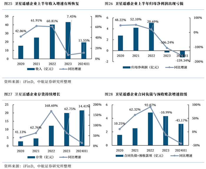 ④ 卫星遥感:2024年上半年,卫星遥感企业收入整体同比增速修复至10%以上,尽管净利润增速出现下滑,但考虑到上半年一般是遥感企业全年内加大投入的时段,且存货维持增长,遥感卫星等空间基础设施建设不断完善,预计下游需求依旧充足,行业增速将迎来修复。