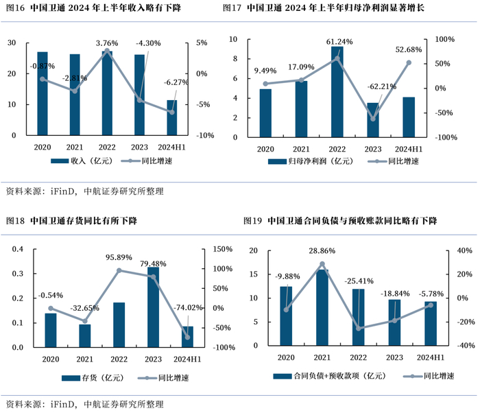 ② 卫星通信:2024年上半年行业收入增速整体仍在个位数波动,卫星通信产业的应用端市场空间尚未迎来明显变化。但无论是传统卫星通信设备与服务在消费级市场上的持续扩容,高轨卫星互联网持续在民航、航海等应用领域拓展,还是卫星互联网产业空间基础设施建设持续推进,都将促使卫星通信产业在中长期维度上逐步提速发展。