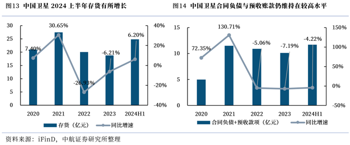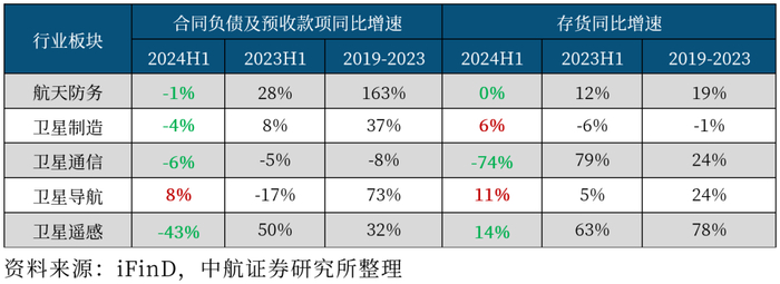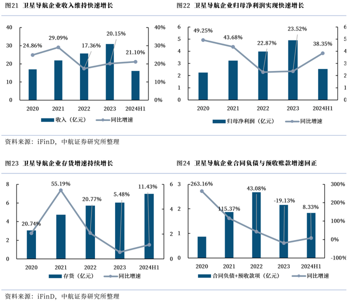 ③ 卫星导航:2024年上半年收入与归母净利润增速持续提升。我们认为,卫星导航相关公司业绩增长主要系我国“北三”卫星导航终端市场渗透率正在不断提升,海外市场正在不断打开所致。同时,2024年上半年合同负债及预收账款增速回正,存货持续正增长,预示了军民属性兼备的卫星导航产业发展速度短期仍将维持在当前水平。
