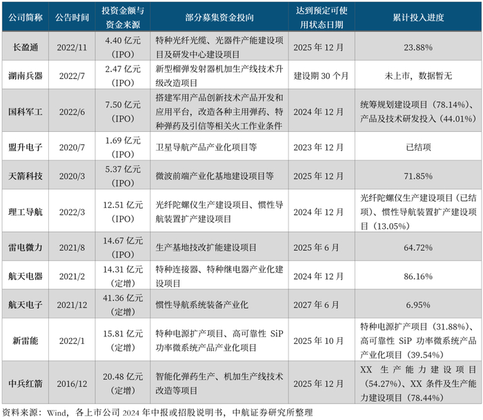 表4 近年来部分导弹/智能弹药企业募集资金扩产规模及最新进度(截至2024年6月30日)