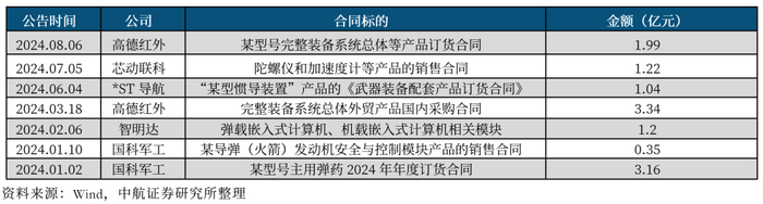 2024年8月6日,高德红外公告,公司与客户签订了某型号完整装备系统总体等产品订货合同,合同金额合计1.99亿元。此外,2024年以来多家航天防务板块公司披露了重大合同签订情况,显示出航天防务板块部分订单有所落地,业绩有望兑现在在2024年年末或2025年的利润表中。
