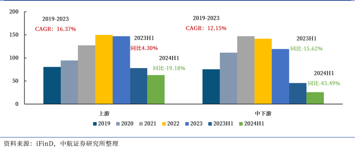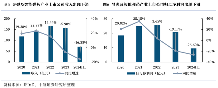 2024年上半年,产业链上游和中下游的上市公司中,导弹与智能弹药相关业务收入合计增速分别为-19.18%和-43.49%,产业链上游收入增速由正转负,而产业链中下游收入同比下降的趋势由2023年上半年延续到了2024年上半年,由-15.62%放大至-43.49%