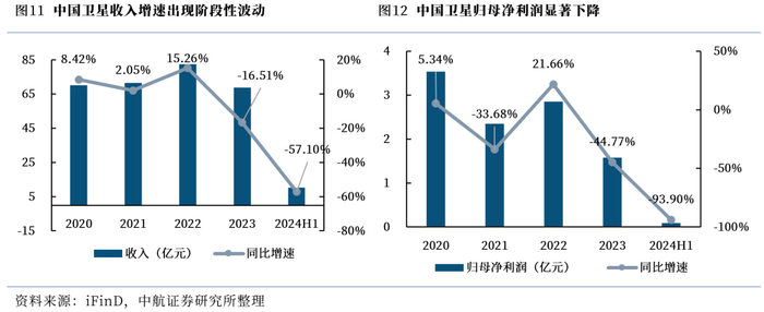 从卫星各细分产业收入增速变化情况来看,2019年-2023前三季度卫星通信上市公司收入增速是卫星通、导、遥三大应用细分领域中增速最低的。从卫星通信产业链下游企业中国卫通2023前三季度的业绩表现来看,收入端与利润端均有下降,也反映出当前卫星通信产业的应用端市场空间仍尚未迎来明显变化。
