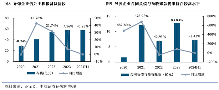 多个企业仍处积极备货状态,合同负债与预收账款仍维持在较高水平。从导弹核心上市公司的合同负债与预收账款等反映在手订单情况的财务数据看,2024年上半年增速虽有所平缓,但考虑到2023年80%以上的高速增长,2024年Q1维持了104.15%的大幅增长,导弹企业订单情况整体有所好转,我们判断业绩兑现或体现在2024年下半年。同时,从存货数据来看,2024年上半年存货虽有所下降,但整体存货仍然较高,反映出导弹企业整体对下游需求兑现的信心仍足,仍在积极备货备产,有望兑现至企业未来的利润表中。