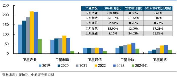 2024年上半年,我国卫星产业整体收入的同比增速转负,部分细分板块的收入依然保持“惯性”趋势。卫星制造、卫星通信以及卫星遥感三大细分板块的增速持续放缓,而卫星导航板块的同比增速较去年同期有所提升。各细分板块如下: