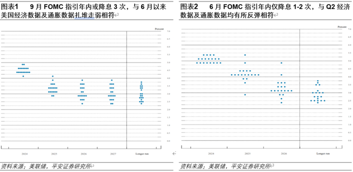 经济预测方面整体变化较大,略调GDP增速,并下修PCE通胀预期、上修失业率预期。本次会议微调GDP 增速预测,仅将2024年GDP增速由2.1%调整为2.0%。而值得注意的是,本次分别上修2024年至2026 年失业率 0.4pct、0.2pct、0.2pct至 4.4%、4.4%、4.3%。同时,将 2024 年PCE 与核心 PCE 同比增速分别下修 0.3pct、0.2pct至 2.3%、2.6%,将 2025年PCE 与核心 PCE 同比增速分别下修0.2pct、0.1pct至 2.1%、2.2%。此外,会议将 2024至2026年的利率预期中值分别由 6 月预测的5.1%、4.1%、3.1%下调至4.4%、3.4%、2.9%,意味着中性利率下调。