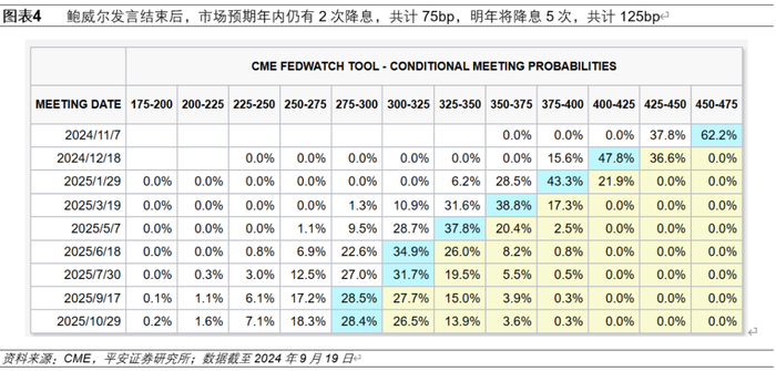 市场反应方面,市场对本次会议的反应较大,货币政策公布后,美元资产迅速上涨,美股三大股指、黄金盘中一度创新高,而鲍威尔鹰派发言后,美元资产快速抹去此前上涨的幅度,收盘时美股三大股指、美元、黄金均下跌,美债利率上行。如前述,市场在会前更多博弈降息幅度是25bp还是50bp,因此,在货币政策公布降息50bp后,美元资产迅速上涨。而后新闻发布会鲍威尔放鹰,表态联储并不急于行动,美元资产快速回落。截至美国时间9月18日收盘,1)美股日内三大股指纳指、道指、标普500分别下行0.31%、0.29%、0.25%,板块方面仅能源、通讯服务两大板块上行,其他板块均下跌,其中公共事业、信息科技领跌;2)美债利率出现上行,2年期、5年期、10年期美债利率分别下行2.1bp、4.7bp、6.2bp至3.63%、3.49%、3.71%;3)美元指数下行0.08%至100.9;4)COMEX黄金下行0.29%至2584.8美元/盎司。CME Fed Watch Tool显示市场预计年内仍有两次降息,其中11月降息25bp,12月降息50bp,同时明年将降息5次共计125bp。