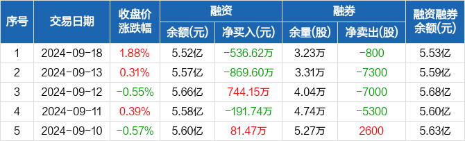 融资方面,当日融资买入1070.09万元,融资偿还1606.71万元,融资净偿还536.62万元。融券方面,融券卖出5700股,融券偿还6500股,融券余量3.23万股,融券余额161.21万元。融资融券余额合计5.53亿元。