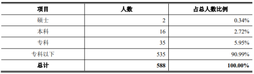 截至2023年6月30日,宏海科技员工总数为588人。其中硕士2人、本科16人、专科35人、专科以下535人,90.99%员工学历在专科以下。