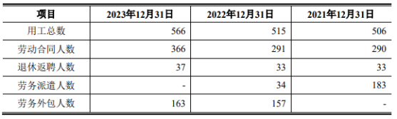2021年-2023年,公司境内用工总数分别为506人、515人、566人,其中劳动合同人数分别为290人、291人、366人,退休返聘人数分别为33人、33人、37人。2021年-2022年,公司劳务派遣人数分别为183人、34人;2022年-2023年,公司劳务外包人数分别为157人、163人。