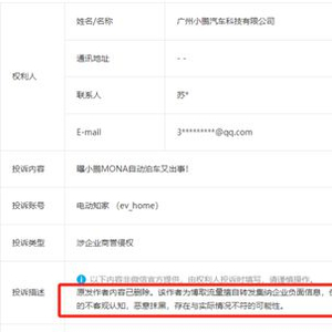 此后该投诉被撤销,后又重新投诉称“文章作者未经沟通,恶意集纳小鹏 MONA MO3 产品问题的负面报道企图抹黑小鹏汽车产品质量,甚至在标题采用不恰当的夸大失实言论“小鹏 MONA 自动泊车又出事”,显然是刻意引流行为,并且文章内容涉嫌不当引用及传播,已实质上侵害了小鹏汽车品牌和产品的名誉权。”