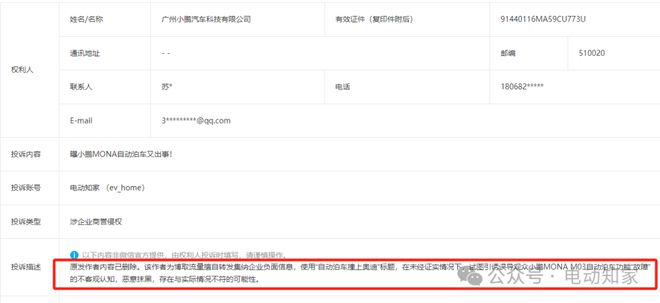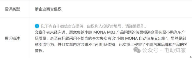 9月17日,电动知家写了一篇小鹏MONA M03自动泊车出事故的文章,详见(),然而很快就收到了“广州小鹏汽车科技有限公司”的投诉称,“该作者为博取流量擅自转发集纳企业负面信息,使用”自动泊车撞上奥迪”标题,在未经证实情况下,试图引诱误导观众小鹏NONA MO3自动泊车功能”故障的不客观认知,恶意抹黑,存在与实际情况不符的可能性。”