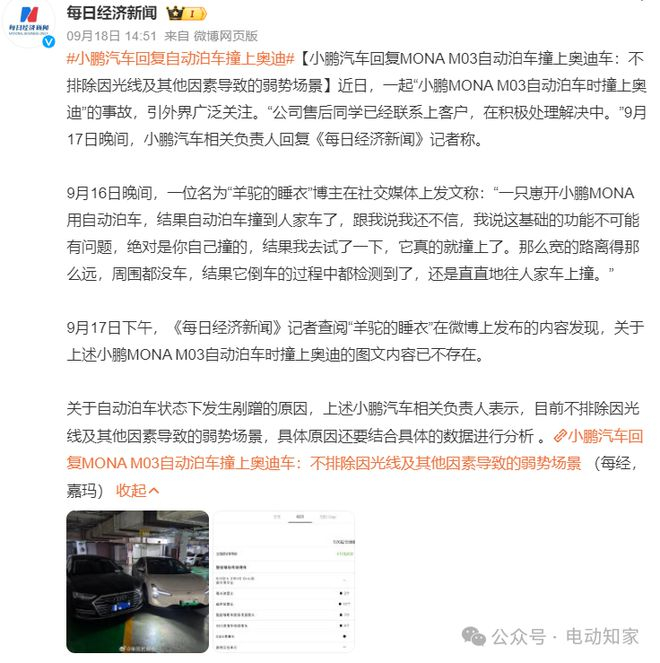 然而,8月18日,每日经济新闻报道,近日,一起“小鹏MONA M03自动泊车时撞上奥迪”的事故,引外界广泛关注。9月17日晚间,小鹏汽车相关负责人回复《每日经济新闻》记者称,“公司售后同学已经联系上客户,在积极处理解决中。”关于自动泊车状态下发生剐蹭的原因,上述小鹏汽车相关负责人表示,目前不排除因光线及其他因素导致的弱势场景,具体原因还要结合具体的数据进行分析 。