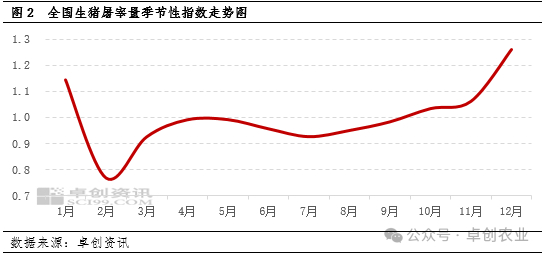 猪肉消费有明显的季节性特点,四季度是传统猪肉需求最旺季,国庆小长假、南方腌腊和北方灌肠皆会提振需求预期。虽然10月份需求端经历国庆中秋后,提升不及预期,但随着气温下降,立冬节气过后南方腌腊逐渐开启,批发市场消化大猪能力增强,白条走货量增加,对行情形成支撑。根据屠宰量季节性指数,10月之后屠宰量季节性指数皆高于“1”,到年底有翘尾,亦反馈四季度的屠宰量居于全年高位。