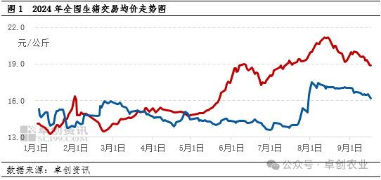 截至2024年9月17日,全国生猪交易均价为16.72元/公斤,同比涨幅达11.66%,生猪市场经历长时间磨底后迎来上涨。但是,8月中旬全国猪价涨至高点后,随之而来是猪价承压下行;截至9月17日,全国生猪交易均价为18.89元/公斤,较年内高点下滑2.26元/公斤,跌幅达10.68%。总体来看,2024年生猪价格上涨周期约3个月,体现为5月至8月上涨,随后猪价开始下跌,这也意味着本轮猪价上涨周期的结束。未来猪价或有阶段性小幅反弹,但预计大趋势或呈走弱态势。