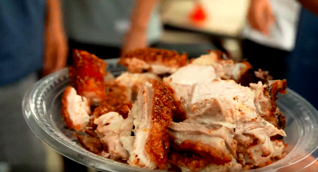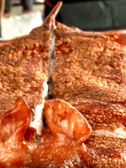 通常选用本地养殖的优质猪种,在烹饪前,会先将整只猪对半切开,抹上特制的酱料进行腌制,让猪肉充分吸收酱料的香味后,再用炭火慢烤,直至猪的表皮变得焦脆金黄就可以出炉了,烤出的乳猪外皮酥脆、肉质醇厚,浓郁的香气四溢,让人闻之即醉。