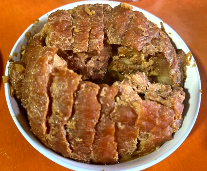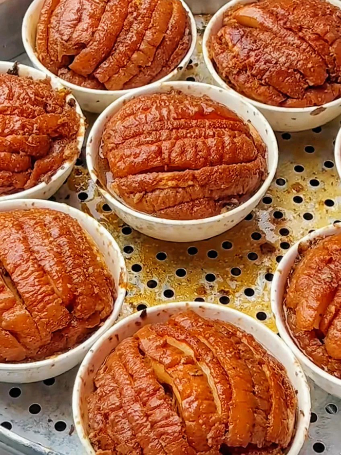 出锅后的扣肉,皮朝下整齐叠放,再经蒸制,让调料充分渗透,味道更加醇厚。夹起一块,晶莹剔透,泛着润泽油光,放入口中,瞬间融化,味觉上肥而不腻,瘦而不柴,香味浓郁,让人食欲大开。
