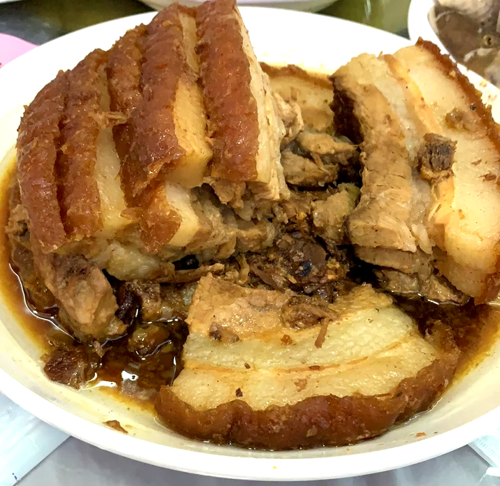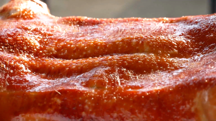 精选上等五花肉,肥瘦相间,经过水煮软化、猪皮扎孔、抹盐腌制等繁复工序,再投入高温油锅炸至金黄酥脆。