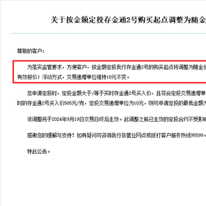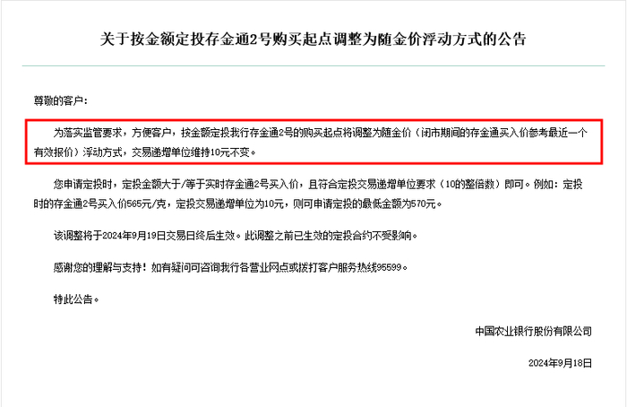 昨日,农业银行在官网发布了《关于按金额定投存金通2号购买起点调整为随金价浮动方式的公告》。