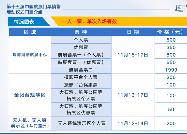 航展中心门票种类共3种,分别是:个人票(每张票价500元)、票价350元的优惠票(适用于60周岁以上和18周岁以下观众,婴幼儿童不免票),以及航展套票。套票有“个人票(或优惠票)+地面装备动态演示区票”“个人票+珠海太空中心门票”等类型。