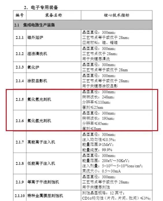 而指导目录中更为先进的氟化氩光刻机,其照明波长为193mm,分辨率≤65nm;套刻≤8nm。