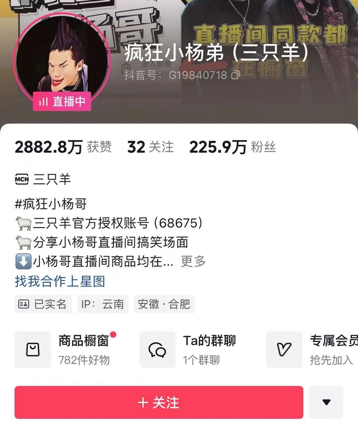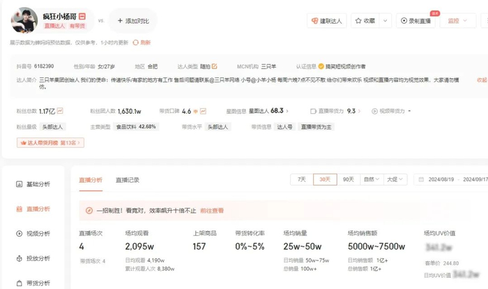 据蝉妈妈平台数据统计,“疯狂小杨哥”账号一天掉粉21.5万。此前媒体报道,最近30天该账号已经掉粉218万。数据显示,疯狂小杨哥达人带货月(8月)榜排名第13位,已经跌出前10。最近30天疯狂小杨哥共直播4场,场均观看2,095万人次,场均销售额在5000万-7000万。