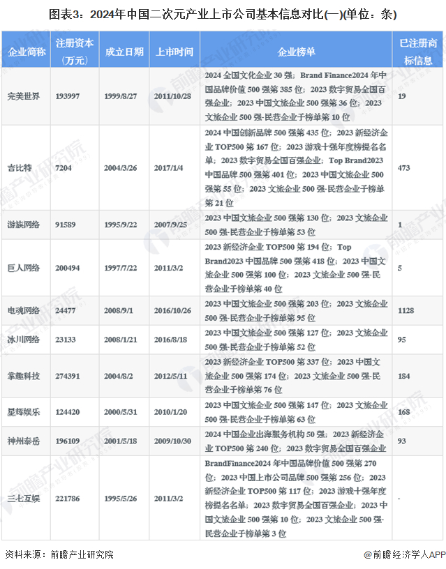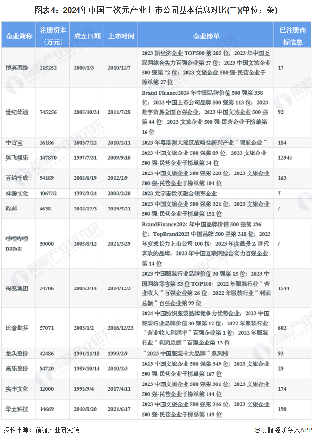 从二次元产业的上市企业布局和已有公开信息分析,注册资本最多的是世纪华通(745256万元),成立时间最早的是高乐股份(1989年),上市时间最早的是龙头股份(1993年),已注册商标信息最多的是奥飞娱乐(12943条)。