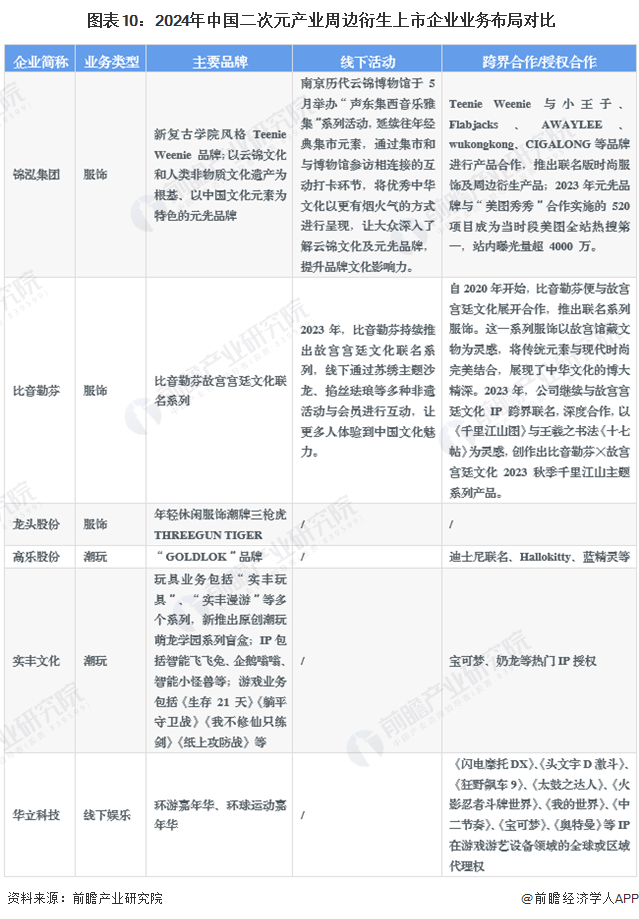 在二次元产业周边衍生上市企业中,企业布局的衍生行业包括服饰、潮玩和线下娱乐,其主要品牌、线下活动和跨界合作/授权情况汇总如下: