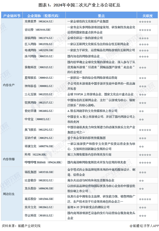 中国的二次元产业主要是指围绕着ACG(包括二次元漫画、二次元动画和二次元游戏)生成的产业集群,具体包括二次元内容市场和二次元周边衍生市场。目前,我国二次元产业上市企业较多,分布在产业链各环节,其中内容生产上市企业最多,包括完美世界、吉比特、奥飞娱乐等。